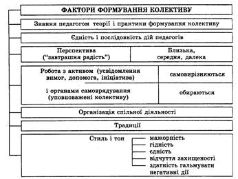 Колектив — це соціально значима група людей, які об'єднані спільною метою, узгоджено діють у напрямку досягнення означеної мети і мають органи самоврядування. Отже, для дієвого колективу характерні взаємозалежні певні ознаки: спільна мета, колективна діяльність, наявність органів самоврядування. А.С. Макаренко наголошував: "Колектив — це соціальний живий організм, який через те і організм, що він має органи, що там є повноваження, відповідальність, співвідношення частин, взаємо-залежність, а якщо нічого цього немає, то немає і колективу, а є просто юрба, або зборище" [43, 105].