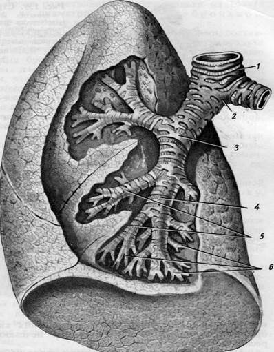 4 — нижний правый бронх; 5 — сегментарные бронхи;