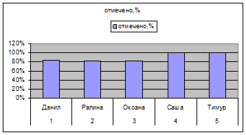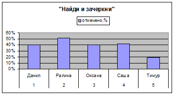 После проведения исследования и обработки результатов было выявлено что у детей с задержкой психического развития по методике «Найди и зачеркни» колеблется между средним и очень высоким уровнем развития продуктивности и устойчивости внимания. У четырех детей по данной методики продуктивность и устойчивость внимания очень высоки. Только у одного ребенка средний уровень развития. Уровень переключения и распределения внимания по методики «Проставь значки» у всех пяти детей оказался очень низким. По третьей же методики показатель объема внимания у всей детей достиг высокого уровня.
