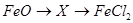 FeO + 2HCl = FeCl2 + H2 O, FeO + 2H+ = Fe2+ + H2 O.