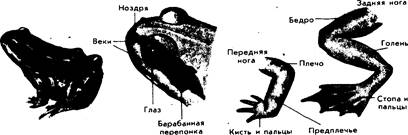 У лягушки хорошо развиты парные конечности — передние и задние ноги. И те и другие состоят из трех главных отделов, но называются они по-разному. В передней ноге различают плечо, предплечье и кисть. У лягушки кисть заканчивается четырьмя пальцами (пятый палец у нее недоразвит). В задней конечности эти отделы называют бедром, голенью и стопой. Стопа заканчивается пятью пальцами, которые у лягушки соединены плавательной перепонкой. Отделы конечностей подвижно сочленены между собой при помощи суставов. Задние ноги значительно длиннее и сильнее передних, они играют главную роль при движении. Сидящая лягушка опирается на слегка согнутые передние конечности, задние при этом сложены и находятся по бокам тела. Быстро распрямляя их, лягушка совершает прыжок. Передние ноги при этом предохраняют животное от удара о землю. Плавает лягушка, подтягивая и выпрямляя задние конечности, а передние при этом прижимает к телу.