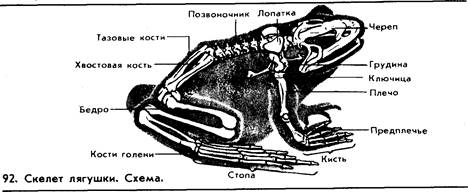 Позвоночник лягушки короткий. В отличие от рыб у лягушки имеется шейный позвонок, лишенный боковых отростков. Он подвижно сочленен с черепом. За ним следуют 7 туловищных позвонков с боковыми отростками (ребра у лягушки не развиты). Шейный и туловищный позвонки имеют верхние дуги, защищающие спинной мозг. На конце позвоночника у лягушки и у всех других бесхвостых земноводных помещается длинная хвостовая кость, которая образуется из нескольких сросшихся хвостовых позвонков. У тритонов и других хвостатых земноводных этот отдел позвоночника состоит из большого числа подвижно сочлененных между собой позвонков.