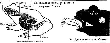 Далее в беседе изучается пищеварительная система. Учитель предлагает вспомнить, чем питается лягушка, как она добывает корм. Обобщая ответы школьников, он отмечает главное — лягушка питается подвижными беспозвоночными, которых она ловит с помощью липкого языка, в акте глотания участвуют глаза. Следует также отметить, что предварительно пища в ротовой полости смачивается слюной — это важное приспособление для проглатывания сухой добычив условиях суши.