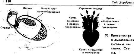 В сердце лягушки правое предсердие содержит только венозную кровь, левое — только артериальную, а в желудочке кровь до известной степени смешанная.