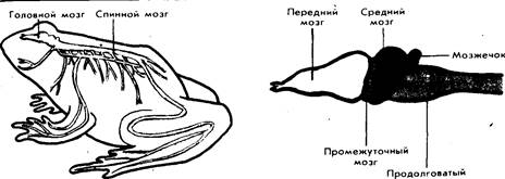 Центральная нервная система земноводных состоит из тех же отделов, что и у рыб. Передний мозг развит сильнее, чем у.рыб, и в нем можно различить два вздутия — большие полушария. Тело земноводных прижато к земле, и им не приходится поддерживать равновесие. В связи с этим мозжечок, управляющий координацией движений, развит у них слабее, чем у рыб.