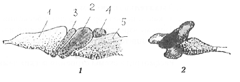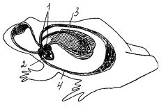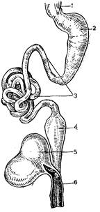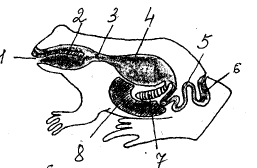 Пищеварительная система лягушки: 1 — пищевод; г —желудок; 3 — тонкий отдел кишечника, 4 — прямая кишка; 5 — мочевой пузырь; 6 — клоака.