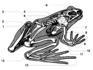 Скелет и мускулатура лягушки. Скелет лягушки состоит из тех же основных отделов, что и скелет окуня, однако в связи с полуназемным образом жизни и развитием ног детали скелета лягушки отличаются рядом особенностей.