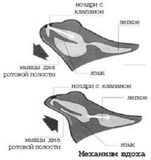 Рассматривая дыхательную систему лягушки, важно обратить внимание школьников на основные особенности ее строения: наличие легких — двух полых тонкостенных мешков, дыхание атмосферным воздухом и своеобразный механизм дыхания нагнетательного типа.