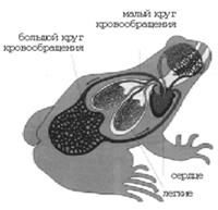 У лягушки кровь из желудочка сердца протекает по артериям во все органы и ткани, а из них по венам оттекает в правое предсердие — это большой круг кровообращения. Кроме того, из желудочка кровь поступает в легкие и в кожу, а из легких обратно в сердце, - в левое предсердие,— это малый круг кровообращения. У всех позвоночных животных, кроме рыб, два круга кровообращения.