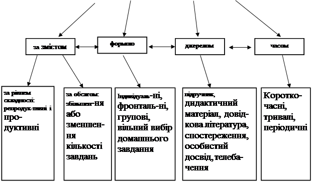 Вид домашньої навчальної роботи, виконуваної учнем, значною мірою залежить від характеру завдання. Виходячи з певних ознак, можна виділити багато видів домашніх завдань. Розглянемо деякі з них.