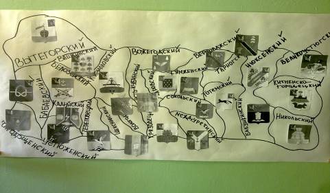 Сегодня на внеклассном занятии мы будем выполнять проект. Мы все живем в Вологде, но как вы уже знаете, Вологда – это областной центр Вологодской области. В Вологодскую область входят 26 районов, у каждого свой герб и своя история. В ходе проекта, мы должны познакомиться со всеми районами Вологодской области, узнать как выглядит их герб и представить небольшую информацию о каждом районе. Итак, как будет называться наш проект? Гербы районов Вологодской области. Что мы будем делать и что получиться в итоге? …. Сейчас послушайте внимательно, я расскажу план выполнения проекта. На доске записаны все районы Вологодской области, один человек берет себе один район и работает по плану. Вы садитесь за компьютеры, находите в сети интернет информацию о своем районе, выбираете самое главное и запоминаете. Затем находите герб района и сохраняете его на рабочем столе. После все эти гербы я распечатаю, вы их вырежете. Когда справитесь с этим заданием, по очереди будете подходить к доске и на карту, вологодской области приклеивать свой герб в нужное место, подписывая район. Определяемся с районом и садимся за компьютер. … Я распечатала ваши гербы, садимся за парты и вырезаем их. Теперь по одному выходим к доске, находим свой район, приклеиваем герб и подписываем район. …. Наша карта готова, посмотрим все ли районы? … Теперь выходим по одному к карте показываем свой район и рассказываем краткую информацию. Начинаем с Вытегорского района. … Все молодцы, у нас получилась настоящая карта Вологодской области, и вы теперь знаете о каждом районе и его герб. |