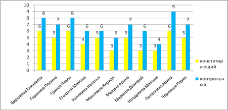 Рис. 7 Сравнительные показатели констатирующего и контрольного этапов эксперимента в контрольной и экспериментальной группах.