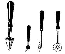 Для нанесення розчинів, що резервують, на тканину, крім пензлів, губок, використовують мідні лійки з отворами різних діаметрів і різні каталки (мал.). Як лійки, так і каталки варто надягати на дерев’яні ручки.