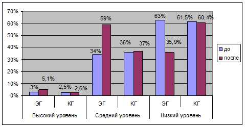 Как показывают данные таблицы, процент школьников в экспериментальной группе, имеющих низкий уровень логического мышления снизился на 27,1 %, средний уровень стал характерен для 59 % испытуемых, что на 25 % больше, чем на констатирующем этапе эксперимента. На 2,1 % увеличилось число школьников, обладающих высоким уровнем логического мышления.