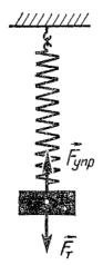 Вначале следует рассмотреть приведенный в учебнике пример с находящимся в состоянии покоя шаром, подвешенным на пружине или резиновом шнуре. При этом, как показывает опыт преподавания, можно не только говорить в общих выражениях о том, что «действия на шар двух тел — шнура и Земли компенсируют (иногда говорят уравновешивают) друг друга», но и указать на чертеже в явном виде действующие на тело силы: силу тяжести Fт и силу упругости (рис. 1).