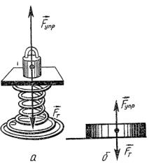 В качестве упражнения и закрепления полученных понятий можно дать учащимся задание самостоятельно указать и изобразить графически силы, действующие на гирю, помещенную на пружину (рис. 2 а) и на шайбу, которая лежит на льду (рис. 2 б).