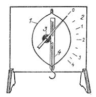 Принцип действия таких динамометров и их конструктивные особенности желательно пояснить с помощью модели, показанной на рисунке 13. На модели отчетливо видна важнейшая часть динамометра — пластинчатые пружины 1, шкала 2 и передающий механизм, состоящий из зубчатых колес 3 и рейки 4.