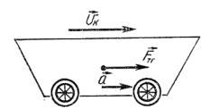 С каким ускорением придет в движение вагонетка массой 400 кг, если на нее начнет действовать сила тяги 100 Н? Указать на чертеже направления скорости, силы и ускорения. Трение не учитывать.