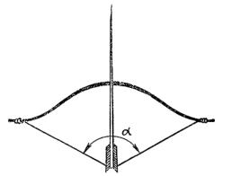 Сила натяжения тетивы лука (рис. 15) 30 Н и угол α=120°. Какое ускорение сообщит тетива стреле массой 40 г?