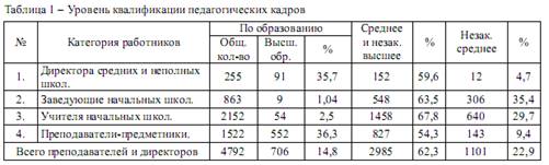 Качественный состав учительства в предвоенные годы имел следующий состав: выходцы из рабочих составляли среди учителей сельских начальных школ только 5,8%, а категория «служащих» и «прочих» равнялась соответственно 43,3%.