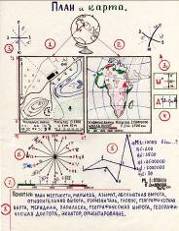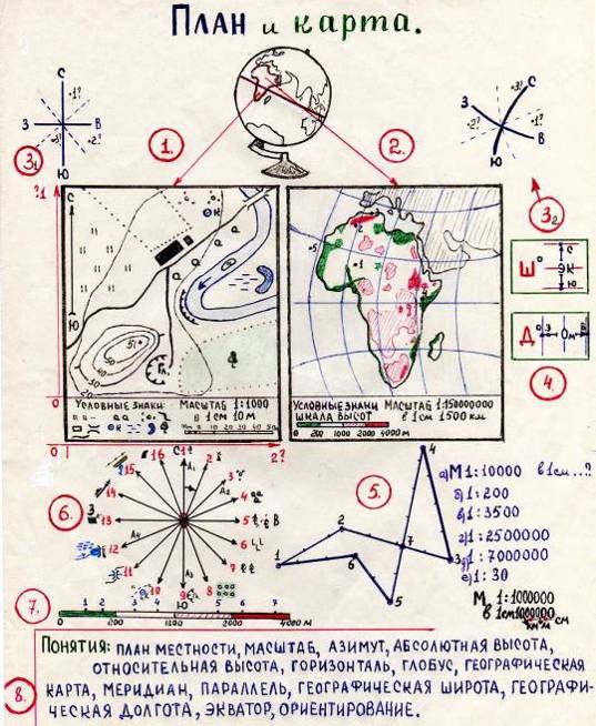 Переходя к рассмотрению темы "Географическая карта", знакомлю учащихся с помощью аппарата учебника с размерами Земли. Для того, чтобы определить, сколько километров содержится в одном градусе по экватору и всем меридианам, использую схему "Географические координаты". С помощью этой же схемы объясняю, как создаются в азимутальной проекции карты полушарий, в конической проекции - карты России. По схеме "План и карта" блок 1.2 находим черты сходства и различия между планом и картой. При изучении темы "Градусная сеть" на глобусе и карте с помощью блока 3.2 опорной схемы "План и карта" знакомлю учащихся с методикой определения направлений на объекты. В основе этой методики лежит определение направлений на стороны горизонта из точек 1, 2, 3 поочередно на соседние точки. Применяя блок 7, разбираю с учащимися определение превышений одной точки над другой и их примерную абсолютную высоту.