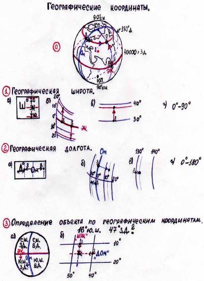 При изучении темы "Географические координаты" использую одноименную опорную схему. На нулевом блоке показываю принцип определения географических координат с участием "Я" ученика. Даю определение "географическая широта" в такой формулировке: