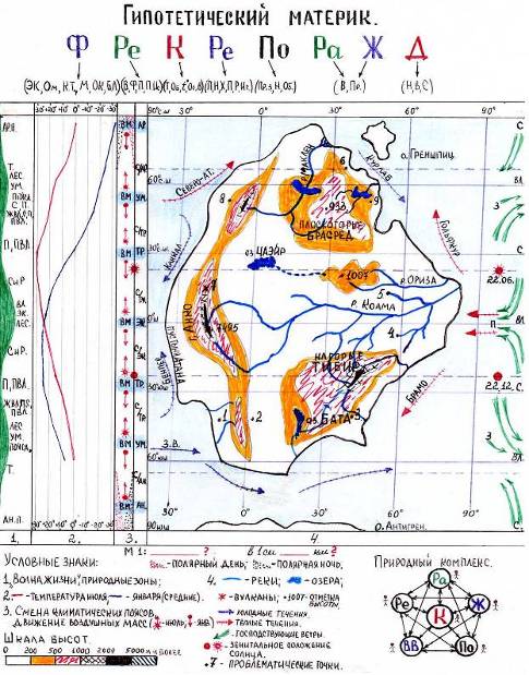 Далее в курсе географии шестого класса изучаются разделы "Литосфера", "Гидросфера", "Атмосфера", "Биосфера", которые увязываются с опорной схемой " Гипотетический материк ФРеКРеПоРаЖД". Последняя схема создавалась по мере изучения и обобщения материала выше названных разделов. При изучении темы "План и карта" знакомлю учащихся с градусной сетью материка. По схеме материка определяем координаты, находим точки по координатам в нетрадиционной обстановке (градусная сеть построена с интервалом в 30 градусов). Определяем размеры материка по градусной мере, масштаб картосхемы, учитывая, что материк существует на планете Земля.