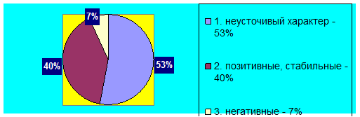 Таким образом, у 53% (01, 02, 05, 06, 08, 11, 12, 14) семей взаимоотношения носят неустойчивый характер, т.е. они могут быть и негативными и позитивными в зависимости от ситуации. У 40% (03, 04, 07, 09, 13, 15) семей взаимоотношения характеризуются как позитивные, стабильные. У 7% (10) семей взаимоотношения негативные.