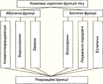 Лісові масиви України, що виконують захисні функції, становлять 1184,9 тис га 3 них протиерозійні ліси мають площу 527,4 тис га, захисні смуги лісів уздовж залізниць, автошляхів шляхів загальнодержавного та обласного значення — 229,9 тис га, особливо цінні лісові масиви — 20,5 тис га, державні захисні лісові смуги — 1,9 тис га, байракові ліси, стрічкові бори, степові — 405,2 тис га. Ліси, що виконують санітарно-гігієнічні та оздоровчі функції, становлять 1751,3 тис га 3 них ліси зелених зон навколо міст, населених пунктів і промислових підприємств займають площу 1581,0 тис га, санітарної охорони джерел водопостачання — 40,2 тис га, санітарної охорони курортів — 116,2 тис га, міські — 13,9 тис га. Ліси спеціального цільового призначення становлять 202,2 тис га, з них заповідників — 135,3 тис га, національних і природних пам'яток — 57,4 тис га, заповідних лісових ділянок, а також лі сів, що мають наукове та і сторичне значення — 9,5 тис га [7].