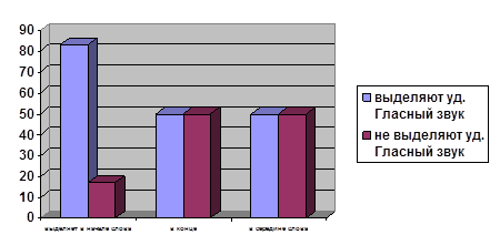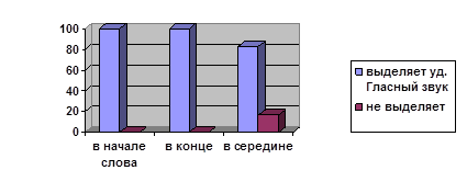 При анализе результатов обследования фонематического анализа у детей младшего школьного возраста с билингвизмом, было выявлено, что 83% детей выделяют ударный гласный звук в начале слова, а 17% детей не выделяют ударный гласный в начале слова. Так же было выявлено, что 50% детей выделяют ударный гласный звук в конце слова, и в середине слова, а остальные 50% не выделяют ударный гласный звук в конце и в середине слова.