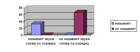 При назывании звук слова по порядку было выявлено, что 33% детей назвали звуки слова по порядку, а 67% детей не назвали звуки слова по порядку.