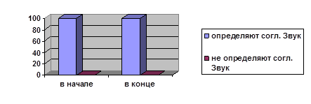 При определении согласного звука, было выявлено, что 100% детей определяют согласный звук в начале слова и 100% детей определяют согласный звук в конце слова.