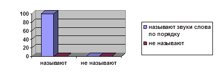 При назывании звук слова по порядку было выявлено, что 100% детей назвали звуки слова по порядку, а 100% детей не назвали звуки слова по порядку.