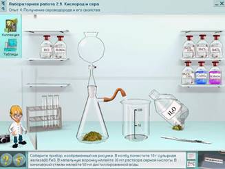 В состав электронного издания «Виртуальная химическая лаборатория для 8-11 классов», разработанного в Лаборатории систем мультимедиа, входят более 150 химических опытов из курса химии средней школы. Содержание данного ППС полностью охватывает весь курс школьной химии. Большое внимание уделяется соблюдению правил техники безопасности. Химические опыты проводятся в реализованной на экране монитора лаборатории со всем необходимым оборудованием и химической посудой (пробирки, стаканы, колбы, ступки, штативы и т.п.), а также химическими реагентами. Для того чтобы избежать переполнения визуального пространства на экране компьютера, учащимся доступен лишь тот набор лабораторного оборудования и реагентов, которые необходимы для проведения конкретного опыта. В некоторых опытах – это емкости с растворами, а в других – сложные химические установки (рис. 1).