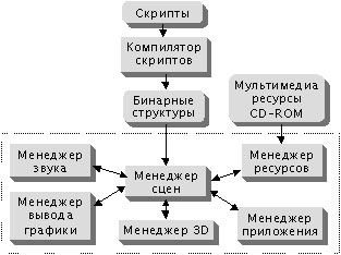 Воспроизведение мультимедиа объектов в соответствии со сценарием производится презентационной программной оболочкой, состоящей из нескольких взаимосвязанных модулей - менеджеров: менеджер приложения, менеджер сцен, менеджер вывода графики, менеджер звука и менеджер ресурсов. Структурная схема авторской программной среды представлена на рисунке 5.