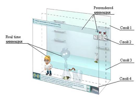 Необходимо отметить, что возможности моделирования в образовательных мультимедиа продуктах во многом зависят от способа доставки образовательного контента. Очевидно, что для доставки через Интернет с его узкими информационными каналами лучше подходит двумерная графика. В то же время в электронных изданиях, поставляемых на CD-ROM, не требуется экономии трафика и ресурсов, и поэтому могут быть использованы трехмерная графика и анимация. Важно понимать, что именно объемные ресурсы - трехмерная анимация и видео - обеспечивают наиболее высокое качество и реалистичность визуальной информации. Однако объемы трехмерной анимации могут быть настолько велики, что даже возможности CD-ROM будут недостаточны для их хранения. Альтернативу объемным файлам анимации и видео, в которых используются последовательность готовых изображений, составляет более компактное представление трехмерных объектов. Синтезированная по этим моделям в реальном времени анимация также предоставляет большие возможности для создания трехмерной образовательной среды, моделирующей реальную лабораторию. Благодаря разумному сочетанию заранее подготовленной анимации и анимации, синтезированной в реальном времени трехмерных моделей, в условиях экономии ресурсов обеспечивается возможность реалистичного представления, как визуального окружения, так и действий учащегося во время проведения экспериментов. Такой подход и был выбран при разработке описанной в этой статье виртуальной химической лаборатории. Химическое оборудование, экспериментальные установки и визуализация сложных химических процессов представляются заранее подготовленными анимациями. В то же время, синтезированные в реальном времени трехмерные модели используются для моделирования химической посуды, жидких и твердых реактивов, действий учащихся в реальной лаборатории (школьники могут приливать из одного сосуда в другой, помещать реактивы в пробирки и доставать склянки с растворами с полок).