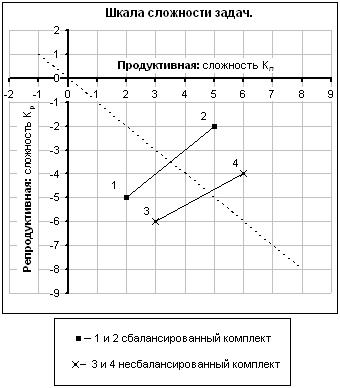 Для данного примера: комплект задач 1 и 2 считаем сбалансированным (задача 2 сложнее задачи 1), а комплект 3 и 4 считаем несбалансированным (задача 4 сложнее задачи 3).
