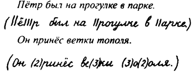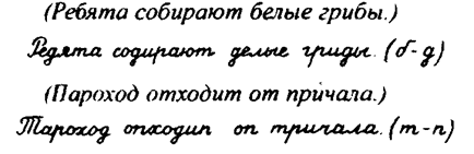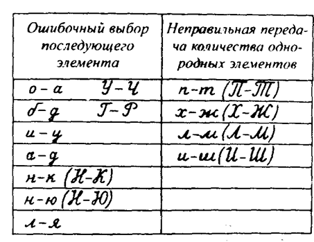 Конечно, могут быть и другие причины ошибок, общие для всех их типов, например: недостаточная координированность движений руки пишущего, неправильное положение тела при письме, плохая освещенность или плохое зрение, механические помехи (плохое перо неровная бумага или, вернее неровная поверхность стола под бумагой) и т. п. Не следует забывать и о таких ошибках письма, которые нельзя определить как графические: несоблюдение строчки, переписывание через линию полей, непропорционально большие (или маленькие) интервалы между словами, недописывание строки и пр. Часты ошибки в соединениях букв.