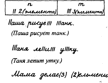 Следовательно, чем скорее дета будут в состоянии осознать и осуществить эту цель — передачу на письме собственных мыслей,— тем успешнее, тем правильнее будет у них формироваться навык письменнойречи. Однако в период обучения грамоте дети пишут еще очень медленно, и передача на письме собственных мыслей, хотя бы и в виде всего лишь одного слова, становится возможной отнюдь не сразу, а лишь на третьей-четвертой неделе обучения грамоте. На втором месяце дети могут записать предложение из двух-трех слов, взятое из их собственных рассказов, а на третьем месяце — два или даже три небольших предложения.
