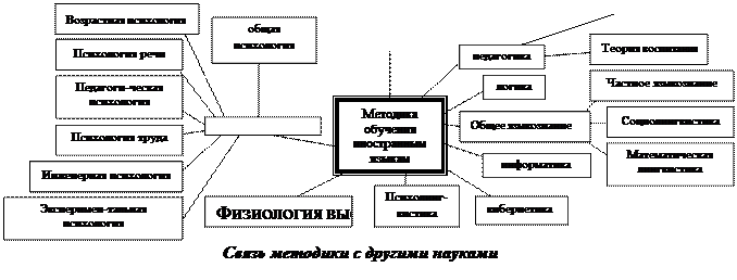 Общее языкознание составляет научную основу методики, так как оно исследует систему разных языков, их взаимовлияние, структуру речи. Частное языкознание предоставляет в распоряжение методики данные о системе родного и изучаемого иностранного языков. Сопоставление систем языков и нормы реализации системы в речи дает возможность определить конкретные трудности в овладении тем или иным языком. Страноведение дает представление о социально-экономическом положении народа, язык которого изучается; о его истории, географии, этнографии и духовном богатстве; о нравах, обычаях, традициях, присущих данному народу и связанных с ними языковых реалиях. Социолингвистика , изучающая причинные связи между языком и явлениями общественной жизни, выявляет функциональную нагрузку языка в разных социальных и профессиональных сферах применения его, что служит основанием для выбора объектов изучения. Социолингвистика описывает экстралингвистическне средства, используемые носителями языка в разных ситуациях общения. Математическая лингвистика – отрасль языкознания, изучающая применение математических методов в исследовании языка и речи. Данные математической лингвистики применяются при проведении экспериментов в методике.