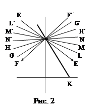 В силу симметрии относительно перпендикуляра CD внутри прямого угла N’CD получим картину, аналогично той, которую мы имеем в угле NCD, т.е. построив угол DCF равный углу DCL, получим прямую CF, также параллельную прямой АВ слева от перпендикуляра CD. Итак, через т. С, лежащую вне прямой АВ, проходят в плоскости АВС две прямые, параллельные прямой АВ, в одну и другую сторону этой прямой. Все прямые, проходящие внутри вертикальных углов, образованных параллельными прямыми LL’ и GG’ (в том числе и евклидова «параллельная» NN’), расходятся с АВ; все остальные прямые, проходящие через т. С сходятся с прямой АВ.