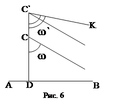 Как уже говорилось выше, через т. С в плоскости САВ проходят 2 направленные параллели к прямой АВ (СЕ и CF), симметрично расположенные относительно перпендикуляра CD (рис.5). Угол параллельности, образованный каждой из этих параллелей с CD, является острым, его величина не постоянна и зависит от расстояния CD(в геометрии Евклида угол параллельности всегда прямой). То, что угол параллельности острый, вытекает непосредственно из аксиомы Лобачевского. В изменении этого угла с изменением расстояния CD можно убедиться путем следующих рассуждений (рис.6).