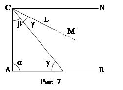 Это предположение эквивалентно аксиоме Лобачевского, то есть из него вытекает эта аксиома и наоборот. Для примера докажем первое. Пусть ( рис.7) в прямоугольном треугольнике CDK сумма углов S= a+b+g<2d, то есть b+g<d .Это значит, что внутри угла NCK можно построить ÐLCK = а (NC^CD).