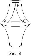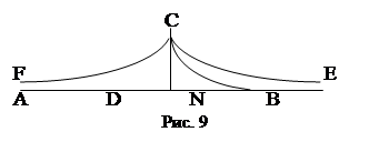 Известно, что сферу можно получить вращением полуокружности вокруг своего диаметра. Подобно тому, псевдосфера образуется вращением линии FCE, называемой трактрисой, вокруг ее оси АВ (рис.9).Итак, псевдосфера – это поверхность в обыкновенном реальном пространстве, на котором выполняются многие аксиомы и теоремы неевклидовой планиметрии Лобачевского. Например, если начертить на псевдосфере треугольник, то легко усмотреть, что сумма его внутренних углов меньше 2d. Сторона треугольника – это дуги псевдосферы, дающие кратчайшее расстояние между двумя ее точками и выполняющие ту же роль, которую выполняют прямые на плоскости. Эти линии, называемые геодезическими, можно получить, зажав туго натянутую и политую краской или мелом нить, в вершинах треугольника. Таким образом, для планиметрии Лобачевского была найдена реальная модель - псевдосфера. Формулы новой геометрии Лобачевского нашли конкретное истолкование. Ими можно было пользоваться, например, для решения псевдосферических треугольников.