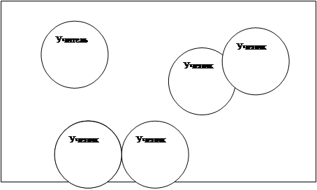 Комфортность взаимодействия детей во время общения на английском языке во многом зависит от того, как используются различные организационные формы обучения. Наряду с широко применяемой фронтальной и индивидуальной работой необходимо более активно внедрять в учебный процесс и другие формы: групповые, коллективные, а также проектные. При этом очень важно по возможности правильно размещать детей в классной комнате. Расположение учеников в классе определяется задачами общения и взаимодействия. На рис. 1 показано размещение учащихся во время работы с доской (при чтении или письме), а на рис. 2 проиллюстрировано расположение детей во время беседы с учителем или друг с другом (при полилоге, например, при обсуждении прочитанной на английском языке сказке и продумывании сценария ее постановки).