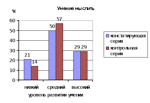 Кроме обучающей серии, наш эксперимент состоял из констатирующей и контрольной серий. Для их проведения были отобраны методики исследования интеллектуальных умений, определяющие уровень интеллектуального развития.