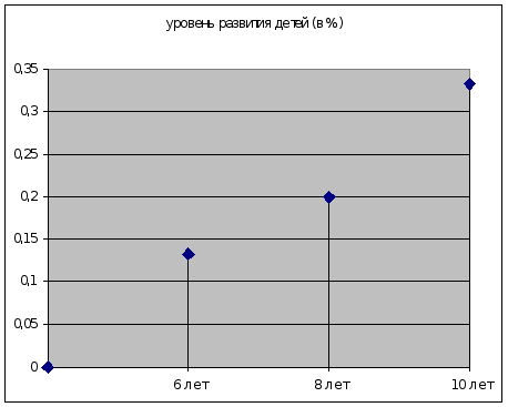 Полученные данные позволяют сделать вывод, что дети шестилетнего возраста имеют низкий уровень развития, затем от шести до восьми лет, учитывая данные исследования, кривая развития начинает расти, а от 8 до 10 лет – снижается. Но, хотелось бы отметить, что у детей шестилетнего возраста, хотя и ниже, чему у других испытуемых ярко выражено стремление составить как можно больше слов, один из испытуемых составил 10 слов, что по данным таблицы характеризуется кА высокий уровень, но поскольку в словах были допущены орфографические ошибки и использованы буквы те, которые отсутствовали в исходном слове, приведенные испытуемым новые слова не учитывались при установлении уровня развития.