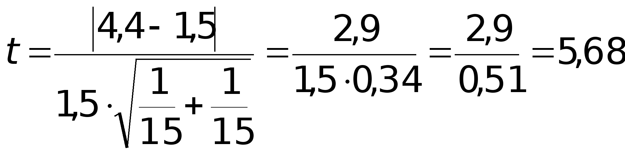Различия в мыслительных способностях (по 5 задаче Пиаже), между выделенными группами детей были оценены по критерию Стьюдента. Вычислим критерий t Стьюдента по формуле:
