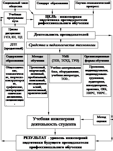 Совокупность выявленных и исследованных многими учеными системообразующих факторов, анализ систем обучения и критериев достижения цели позволяют синтезировать основы дидактической системы общетехнической подготовки в вузе будущего преподавателя профессионального обучения (рис. 1).