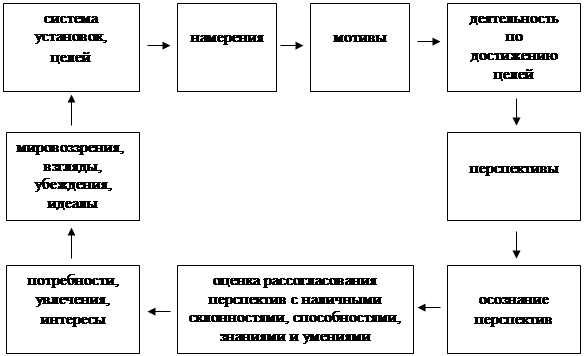 Как показано на этой модели, потребности, увлечения и интересы студента возникают на основе осознания перспектив и адекватной оценки степени рассогласования требований перспектив с наличными склонностями, знаниями и умениями. На основе общезначимых перспектив формируются мировоззрения, взгляды, убеждения и идеалы, система целей и установок, намерения. Перспективы выступают в данном случае в качестве отдельной цели студента.
